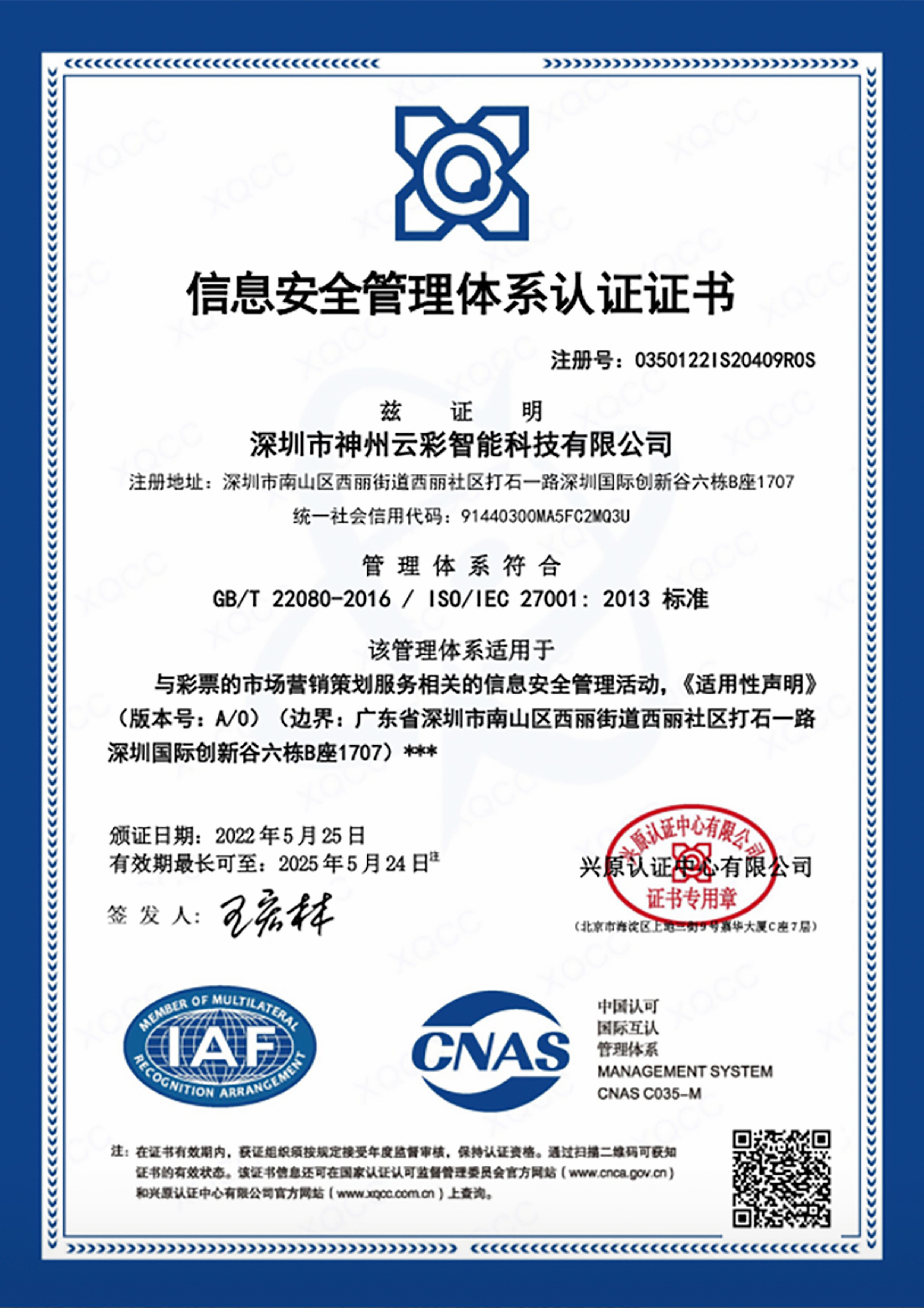 信息安全管理體系認證證書